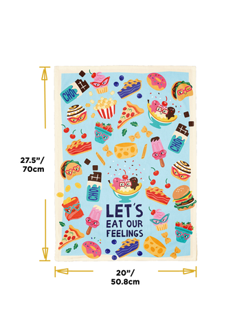 ──────────────── Elevate your kitchen with our new dish towels! Crafted from thick absorbent cotton & expertly designed, these towels are built to sit pretty while handling your toughest kitchen tasks. ──────────────── Size •Dish towel size: 27.5" x 20" / 70cm x 50.8cm ──────────────── Materials & Attributes •100% cotton •Print on Dish Towel: "Let's Eat Our Feelings" •GSM: 250 •Top-corner ribbon detail for simple hook placement ──────────────── Care •Machine or hand wash in cold water and hang to dry •Do not iron or bleach ──────────────── Shipping and Returns Policy Free shipping on orders over $60.