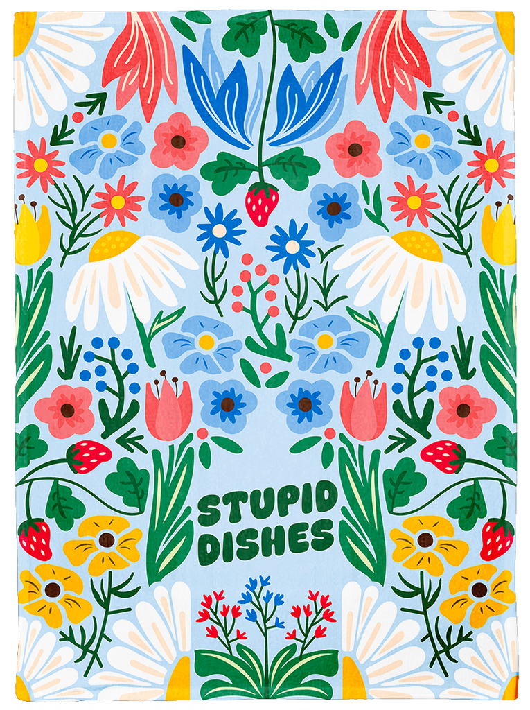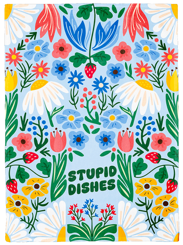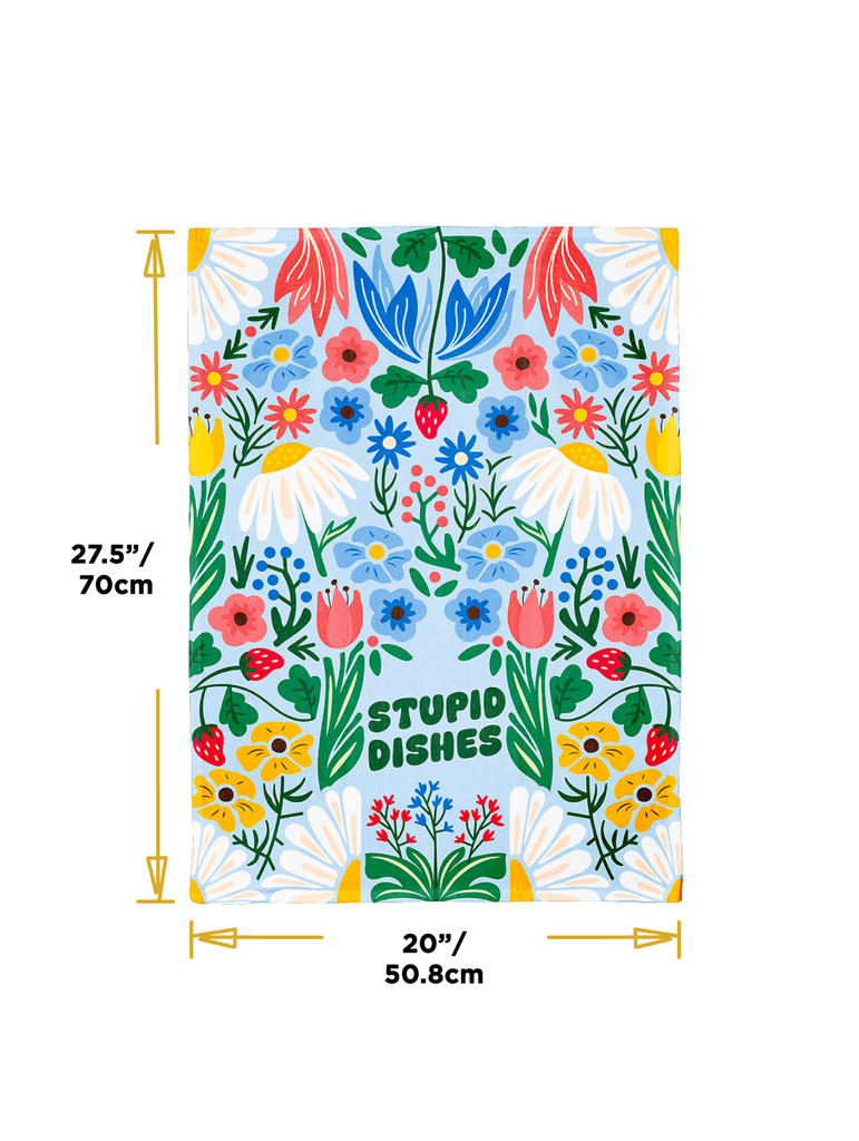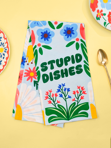 ──────────────── Elevate your kitchen with our new dish towels! Crafted from thick absorbent cotton & expertly designed, these towels are built to sit pretty while handling your toughest kitchen tasks. ──────────────── Size •Dish towel size: 27.5" x 20" / 70cm x 50.8cm ──────────────── Materials & Attributes •100% cotton •Print on Dish Towel: "Stupid Dishes" •GSM: 250 •Top-corner ribbon detail for simple hook placement ──────────────── Care •Machine or hand wash in cold water and hang to dry •Do not iron or bleach ──────────────── Shipping and Returns Policy Free shipping on orders over $60.