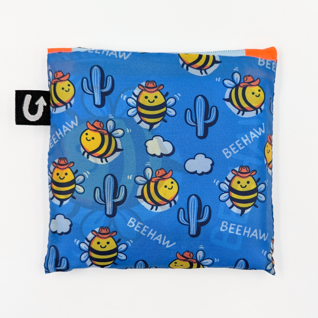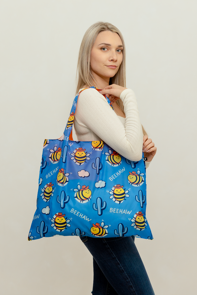 ──────────────── Make your shopping spree a stylish and sustainable adventure with Uptown Sacs - our new foldable tote bags! Made 100% from recycled PET bottles. ──────────────── Size and Weight Capacity •Bag size: 19.5" x 16.5"/ 50cm x 42cm •Can carry up to 20kg/44lbs •Zippered storage pouch size: 4.5" x 4.5"/11.5 x 11.5cm ──────────────── Materials & Attributes •Made from 100% recycled PET bottles •Water resistant and does not fade •Print on Bag: "Beehaw" •Includes a convenient small pocket inside the bag •Is foldable and includes a convenient zippered storage pouch ──────────────── Care •Machine or hand wash and hang to dry •Do not iron or bleach ──────────────── Shipping and Returns Policy Free shipping on orders over $60.