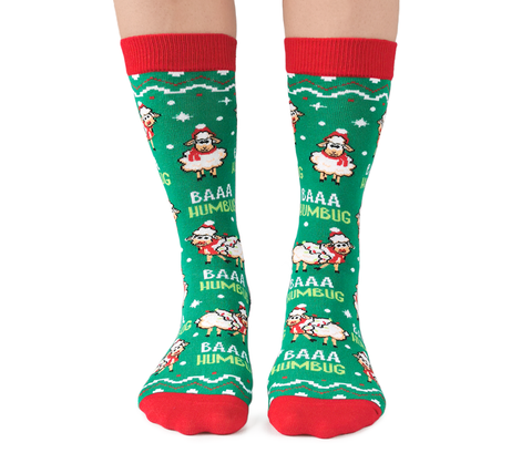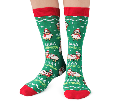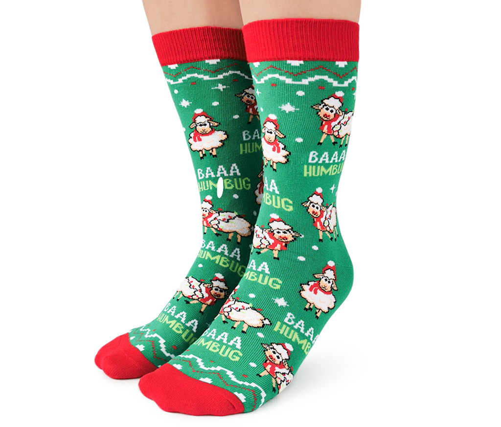 ──────────────── Size Women's shoe size 6-9 Men’s shoe size 4-7 EUR 37-41 ────────────────Materials & Attributes 70% Combed Cotton, 28% Nylon and 2% Spandex. Reinforced stitching on toe to protect from wear. Print on Socks: "Baaa Humbug" ────────────────Care Machine wash and hang to dry. Do not iron or bleach. ────────────────Shipping and Returns Policy Free shipping on orders over $60.