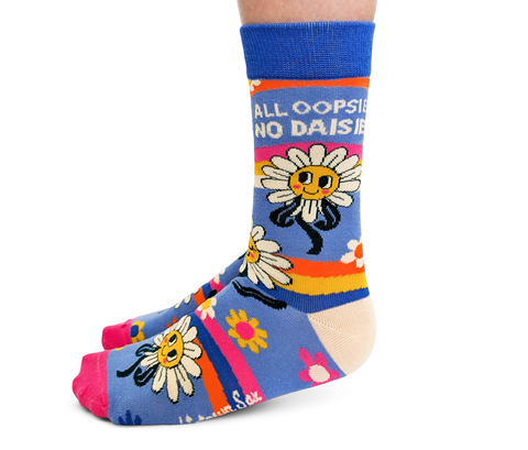 ──────────────── Size Women's shoe size 6-9 Men’s shoe size 4-7 EUR 37-41 ──────────────── Materials & Attributes 70% Combed Cotton, 28% Nylon and 2% Spandex. Reinforced stitching on toe to protect from wear. Print on Socks: "All Oopsies No Daisies" ──────────────── Care Machine wash and hang to dry. Do not iron or bleach. ──────────────── Shipping and Returns Policy Free shipping on orders over $60.