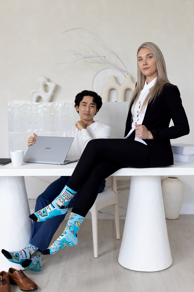 ──────────────── Size Women's shoe size 6-9 Men’s shoe size 4-7 EUR 37-41 ──────────────── Materials & Attributes 70% Combed Cotton, 28% Nylon and 2% Spandex. Reinforced stitching on toe to protect from wear. Print on Socks: "None of Your Emails Are Finding Me Well" and "Please Hesitate to Reach Out" ──────────────── Care Machine wash and hang to dry. Do not iron or bleach. ──────────────── Shipping and Returns Policy Free shipping on orders over $60.